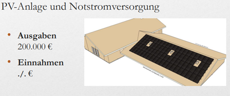 Die südliche Dachfläche der Fahrzeughalle sowie die Dachflächen des Garagen-Neubaus werden mit PV-Modulen ausgestattet. Vorgesehen ist zudem ein Batteriespeicher, der die Notstromversorgung sicherstellen soll.
