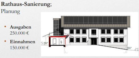 Für Planungsleistung zur Sanierung oder Neubau des Kurhauses/Schwimmbads sind im Haushalt 240.000 EUR eingestellt. Zur Sanierung des Schmutzwasserkanals in Obergrainau sind in 2024 Ausgaben in Höhe von 343.000 EUR vorgesehen.