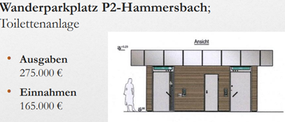Angesichts der anhaltenden hohen Besucherzustroms scheinen öffentliche Toiletten sowohl am Wanderparkplatz in Hammersbach als auch am Eibsee „überfällig“ zu sein. Die Toilettenanlage am Eibsee soll optisch der oben dargestellten Anlage in Hammersbach entsprechen, jedoch etwas größer dimensioniert sein. Deshalb ist hier mit Kosten von 460.000 EUR (bei einer Förderung von 276.000 EUR) zu rechnen.