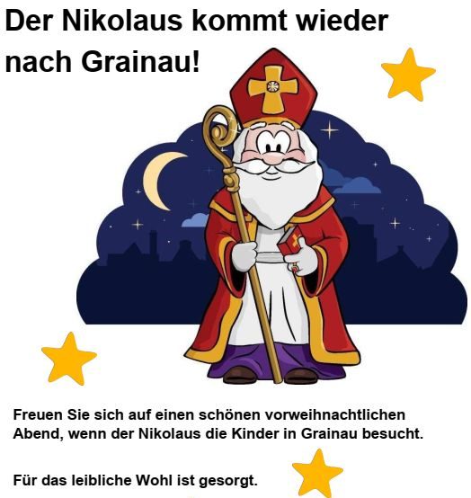 Der Nikolaus freut sich auf alle Grainauer Kinder mit ihren Mamas und Papas, Omas und Opas, Geschwistern und Freunden und sorgt auch für ein kleine Stärkung bei Kinderpunsch und Glühwein.