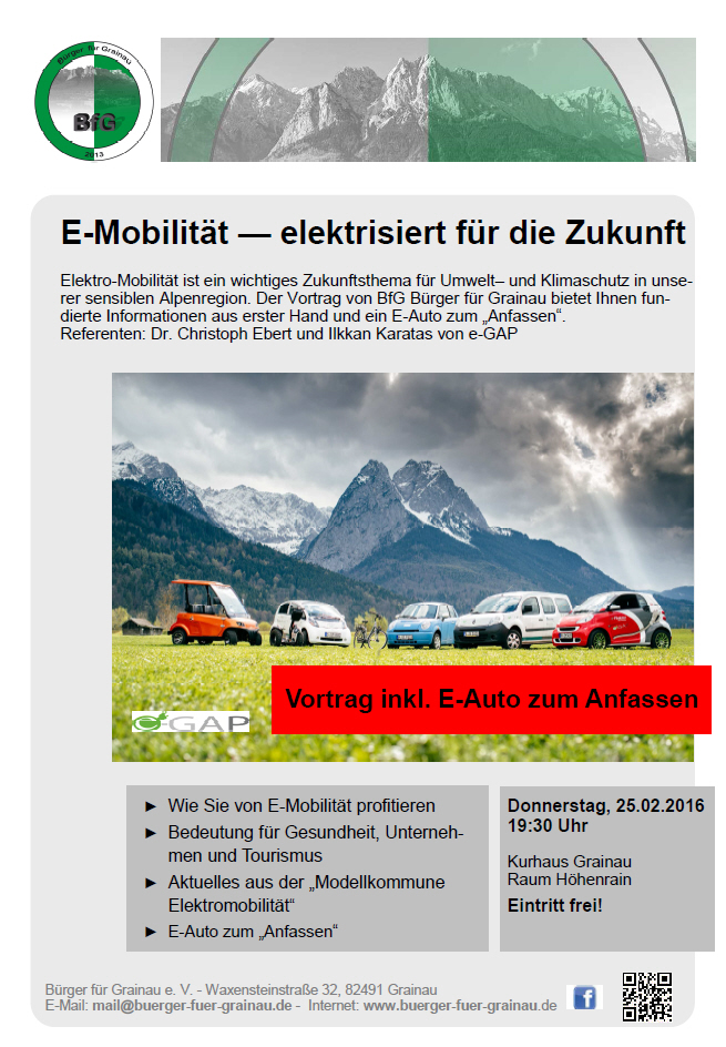 Dr. Christoph Ebert und Ilkkan Karatas von e-GAP stellen Ihnen unter anderem vor, wie Sie von Elektromobilität profitieren können, was Elektromobilität für Unternehmen, Gesundheit und Tourismus bedeutet und welche Ergebnisse und Erfahrungen es aus den e-GAP Projekten des Forschungsvorhabens „Modellkommune Elektromobilität“ gibt, an dem Garmisch-Partenkirchen teilnimmt.